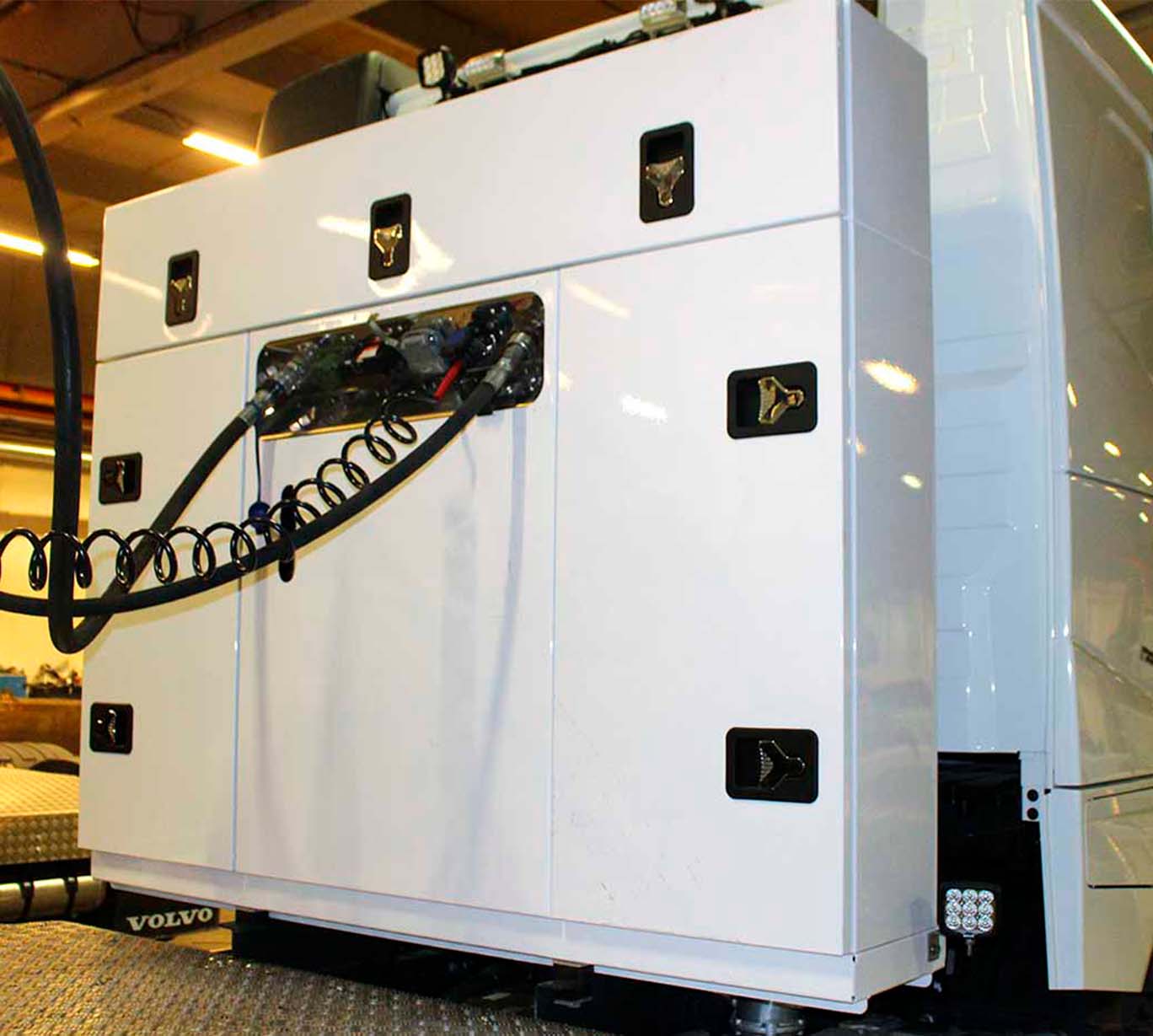 I samarbete med våra kunder har vi utvecklat ett låd-/tanksystem. Detta smarta system kombinerar BevoBox™ verktygslådor, som är platsbesparande och monterade bakom förarhytten. På så sätt finns det möjlighet till extra förvaring. Den har även justerbar montering för olika chassibredder.